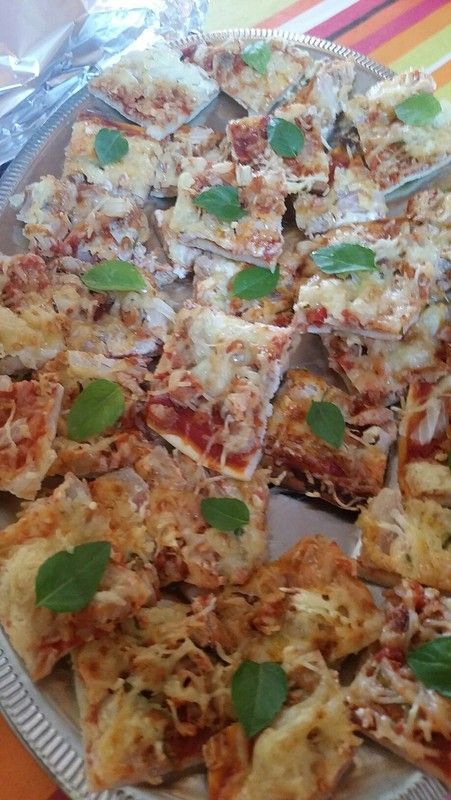 Pour l'apéro découpez votre pizza en petits morceaux . Puis ajouter les feuilles de basilic dessus.